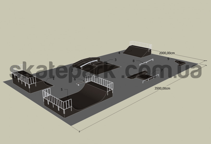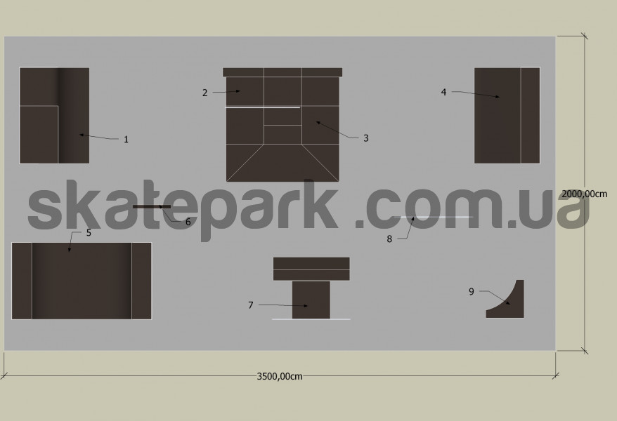 Quarter pipe + roll-in, Funbox z grindboxem 3/3 + poręcz 2/3, Funbox piramida 2 + manual box, Bank ramp, Minirampa H120, Ławka 1, Grindbox 9 + grindbox 1 + poręcz prosta – profil O, Poręcz łamana – profil [], Grindbox 6