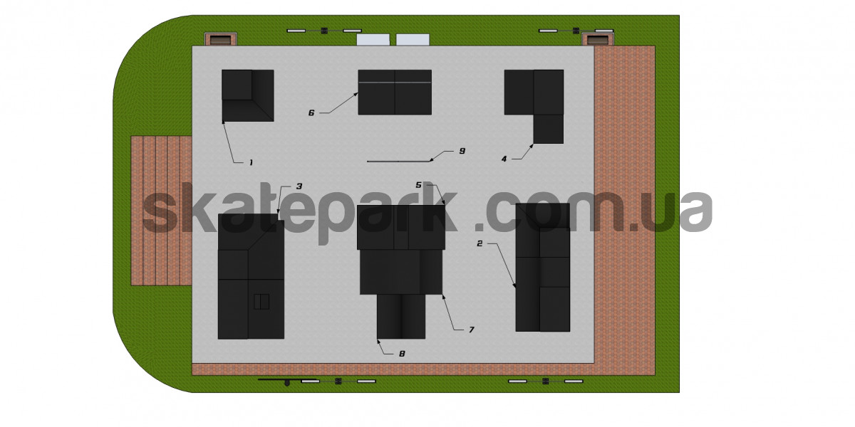 2x Quarter pipe 90st piramida , Quarter pipe + roll-in, + 2x Quarter pipe 90st piramida, Bank ramp + mini quarter, + 2x Bank ramp 90st piuramida, 2x Bank ramp 90st, Funbox (podest 122), Funbox z poręczą, Funbox do skoków, Spin, Poręcz łamana – profil[]