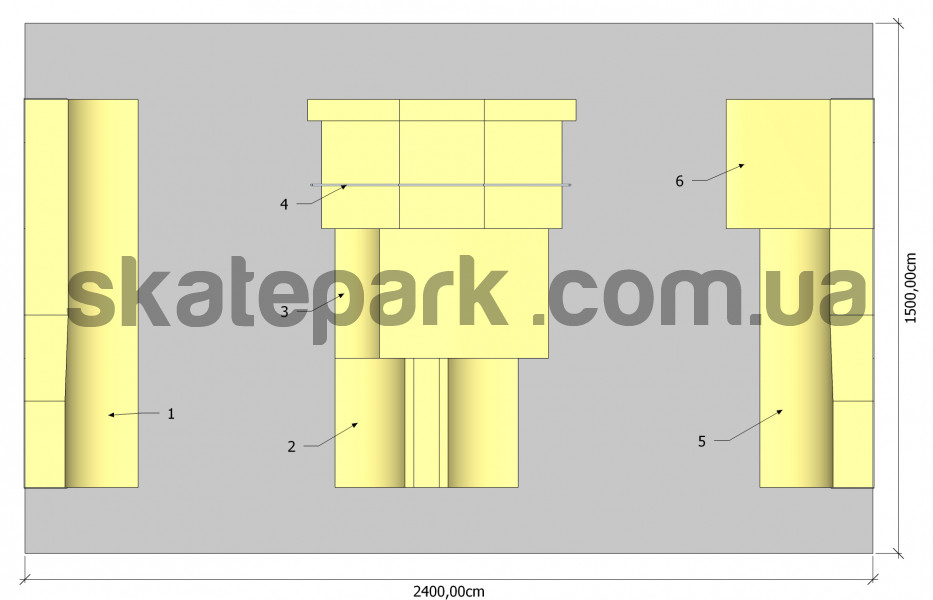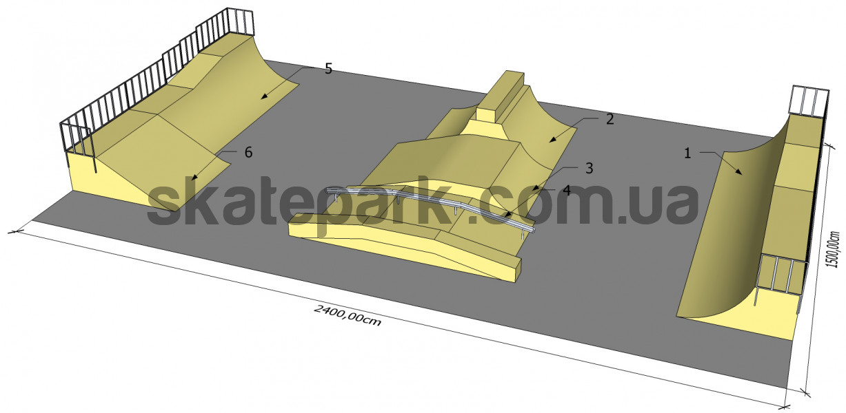 Quarter pipe, Spin ramp, Funbox for jump, Funbox with grindbox 3/3 & grindrail 3/3, Quarter pipe, Bank ramp,