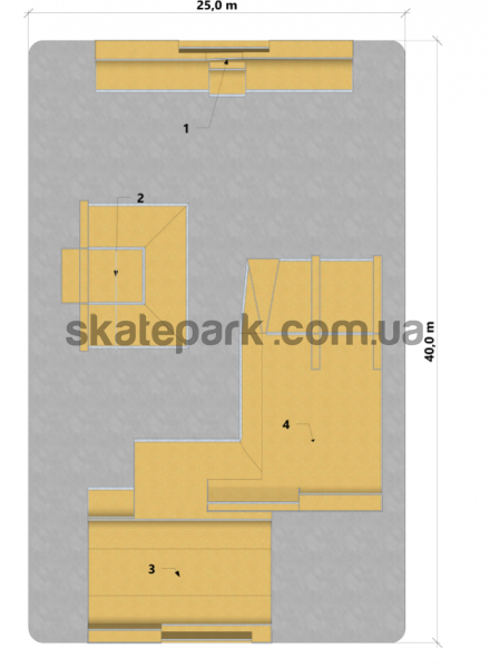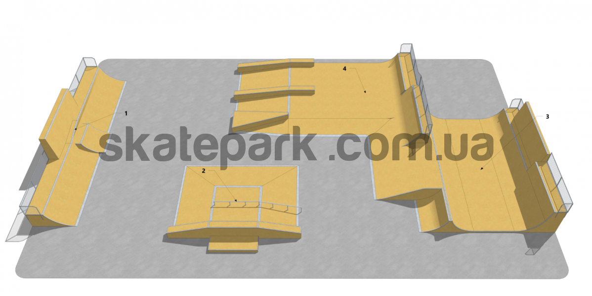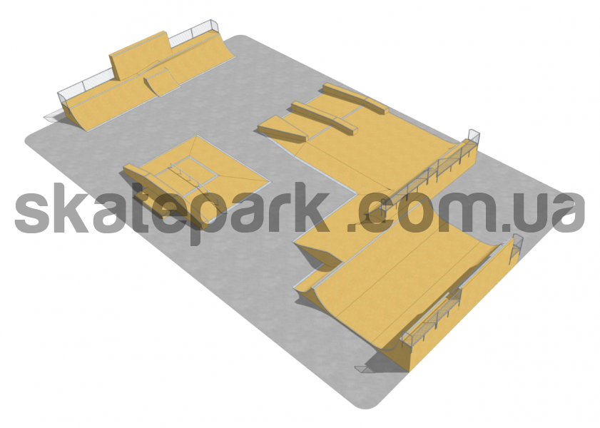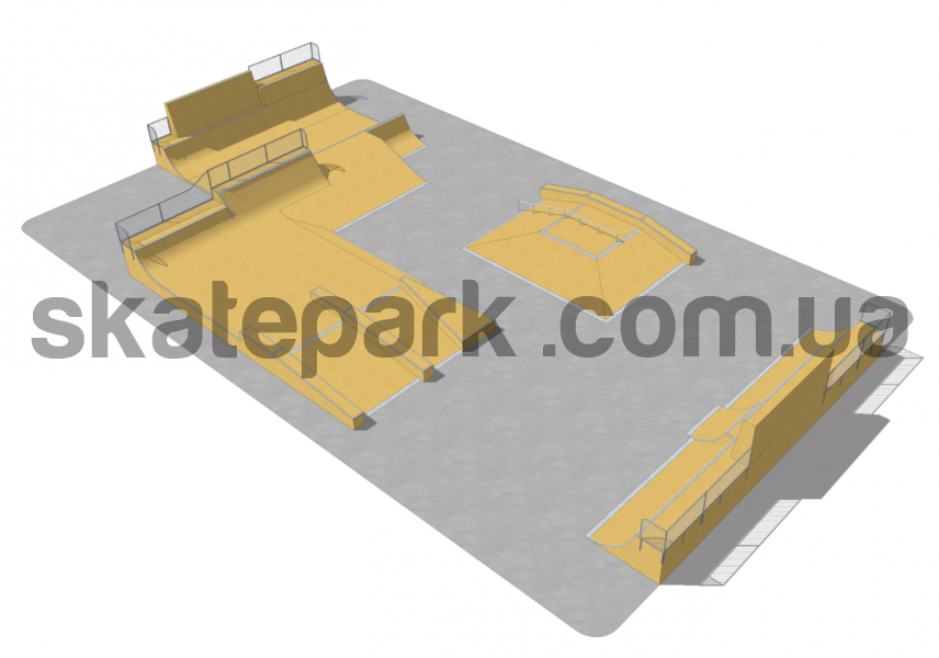 Quarter Pipe + Mini Quarter and Wall ride 345x1708x150/180/390 Funbox with grindbox 3/3 + rail 2/3 + Funbox pyramid 2 + Grindbox 1 966x848x30/90 Miniramp H150 with Spin ramp + Wall ride + Jumpbox 1353x1220x150/260/350 Platfrom 1681x947x80/200