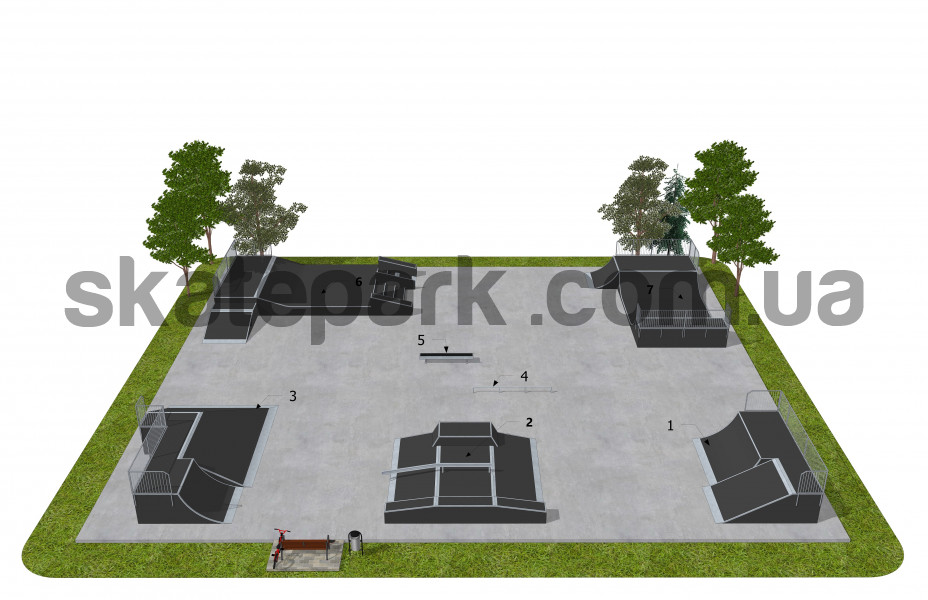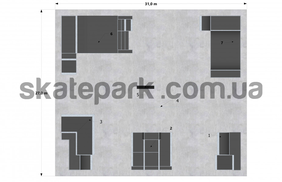 Quarter pipe + bank ramp 416x610x150 Funbox with grindbox 3/3 + rail 2/3 + grindbox 3/1 660x610x45 2x bank ramp pyramid + quarter pipe 538x905x150 Straight rail 400x5x35 rind bench 286x60x35 Platform with rail, stairs, grindboxs, London gap + bank ramp 1150x960x60/90/120 Minirampa + quarter pipe 1005x666x120