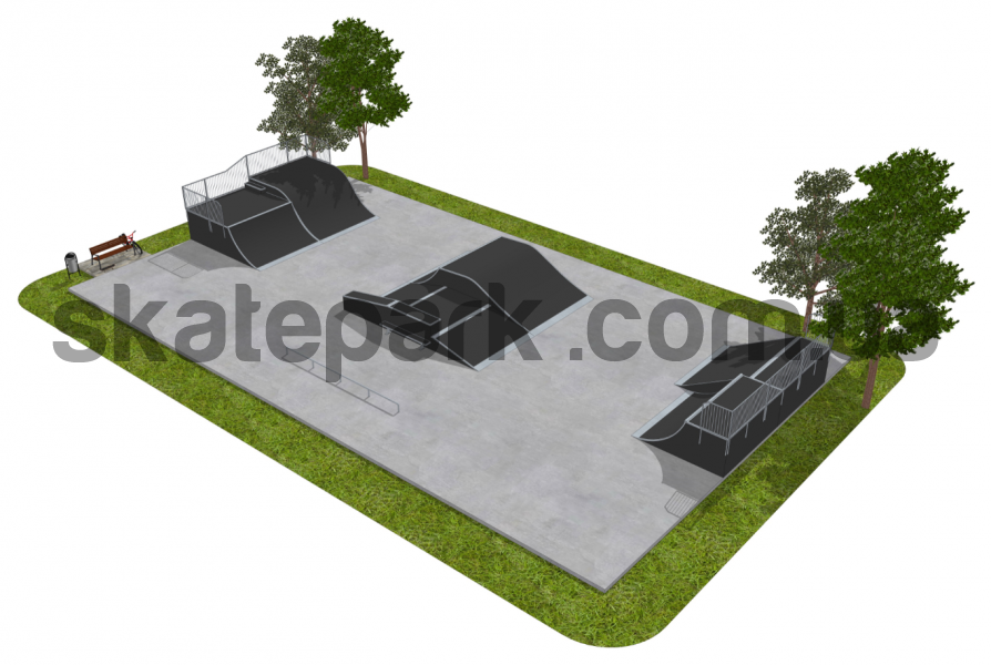 Skatepark modułowy w technologii standard. Skatepark składa się z wysokich przeszkód, projektowany z myślą o wysokich lotach.