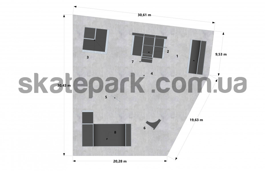 Quarter pipe dwa poziomy 345x732x180/150 Funbox z grindboxem 3/3, poręczą 2/3 i grindboxem 720x488x60 2x Bank ramp 90st piramida 538x538x150 Poręcz łamana 500x5x30/50 Poręcz prosta mała - profil 250x8x35 Grindbox 6 243x243x35 Grindbox 7 243x121x25/40 Minirampa H150 + Bank ramp 1075x782x150